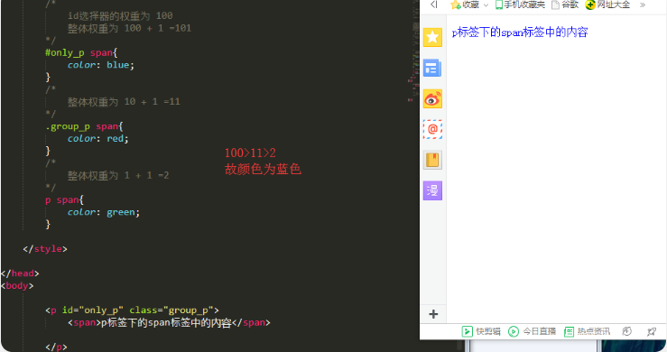 css选择器的权重计算:多种选择器同时作用于同一标签,权重该如何计算?id选择器的权重为100,类选择器的权重是10,标签选择器的权重是1。