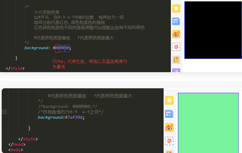 背景颜色:通过16进制色值或者RGB值和颜色单词等来设置div或者网页的背景